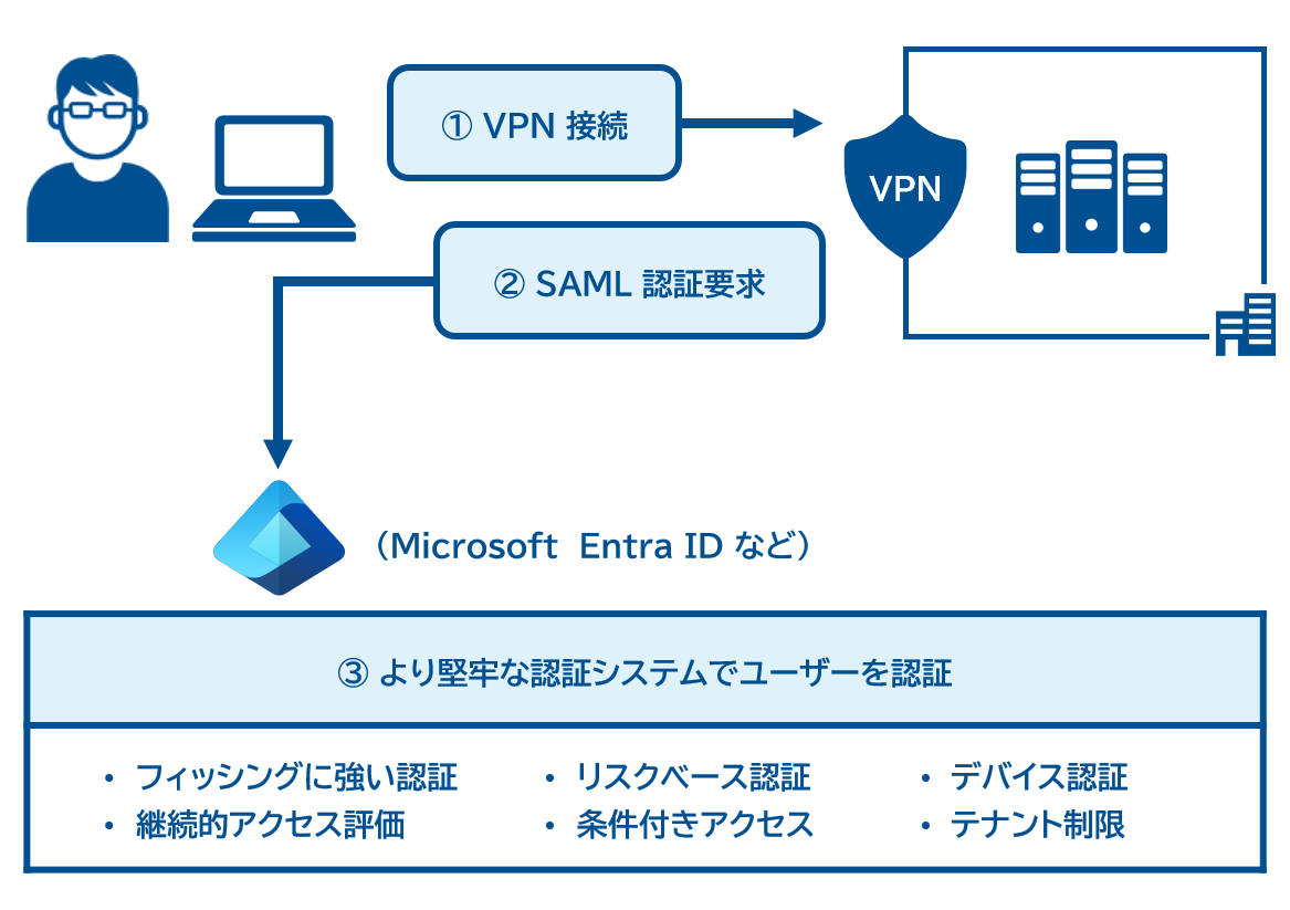 SAML はアクセスしてきたユーザーの認証を他のシステムにお願いする技術です。SAML を使って Microsoft Entra ID のような、より堅牢な認証システムに VPN ユーザーの認証をお願いします。強度の高い認証に合格しなければ VPN 接続できません。VPN 単体で認証しないことが結果としてランサムウェア対策になります。