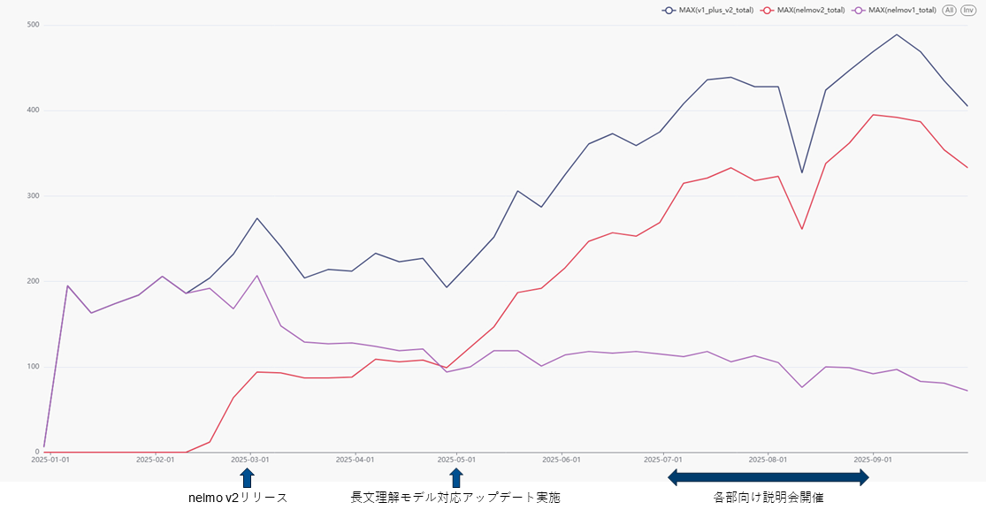 これを受けて、利用状況を可視化したデータを分析し、利用者拡大にはUIの改善が有効であるという仮説を設定。AI初心者の方にも直感的に使えるUIを目標に改良を重ね、2024年第4四半期に「nelmo version 2 Beta(nelmo v2b)」をリリースしました。