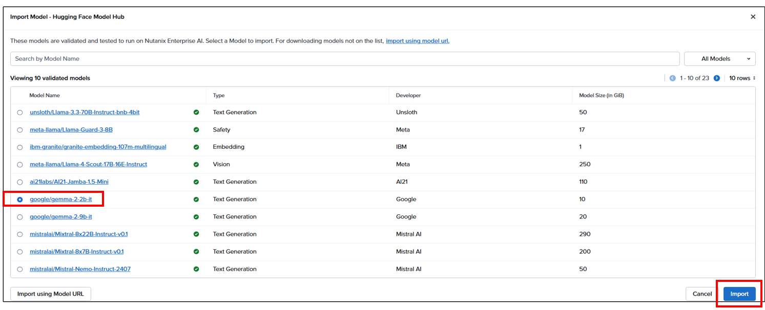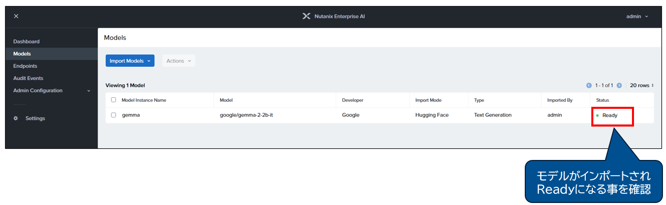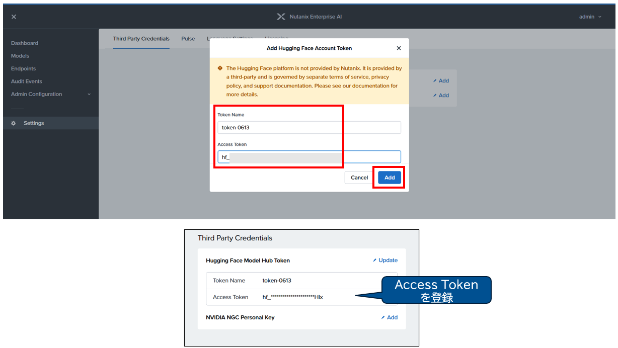 NAI管理コンソール > 「Models」> 「Import from Hugging Face Model Hub」より、Hugging Faceのモデルをインポートします。今回は比較的軽量な、Google gemma2のモデルをインポートして使用します。Importにあたっては、Hugging FaceのサイトよりAccess Tokenを取得の上、「Settings」メニューより登録する必要があります。