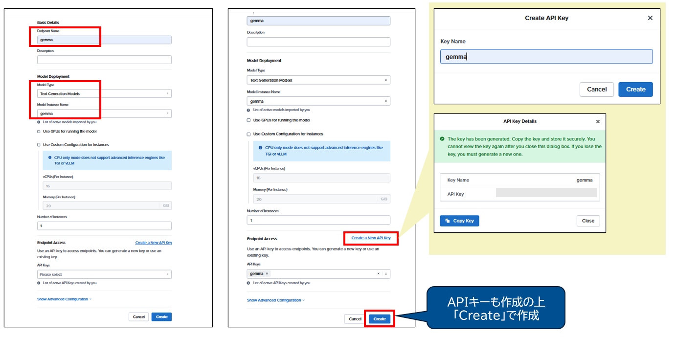 続いてエンドポイントを作成します。名前、モデルの指定、APIキーの作成を実施の上、「Create」で作成します。
