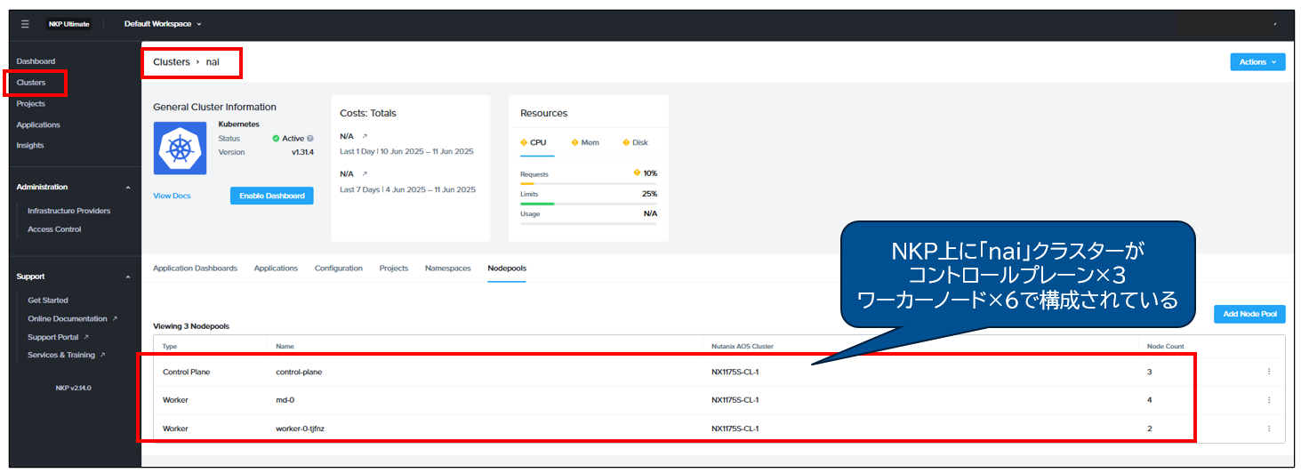 まず、NAIのインストール用にNKPの管理コンソールにて、ワーカーノードをNAIのモデルの実行に十分なリソースで用意します。下記の例では「nai」という名前のクラスターを、vCPU 8、RAM 32GiB、Disk 80GiB の構成のコントロールプレーン3台とワーカーノード6台で展開しています。