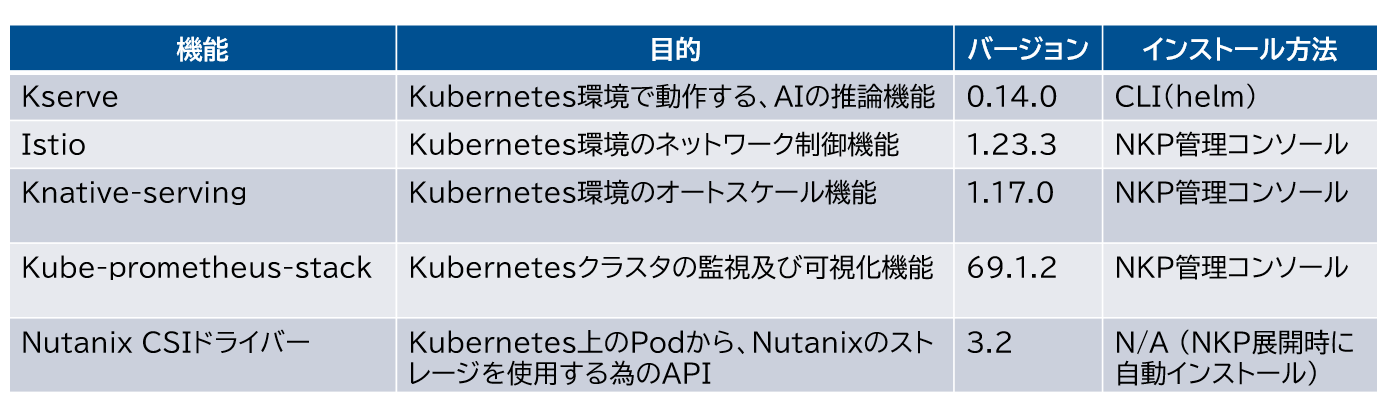 ・検証構成及びバージョン:NX-1175S-G8(GPU搭載無し)、AOS 7.0.0.5、AHV 10.0.0.1、Prism Central pc.2024.3.0.1、NKP 2.14、NAI 2.3