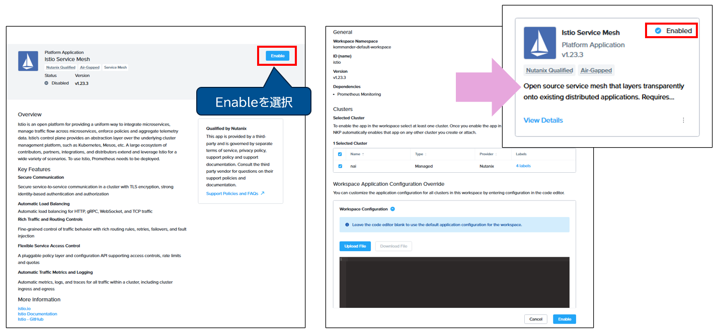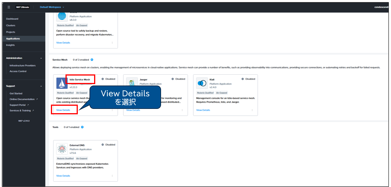 NKP管理コンソールからインストールする手順は下記の通りです。CLIによるKserveのインストールについては、こちらのURLの内容に従って実施します。NKP管理コンソールを利用したインストールは、 「Applications」 > 該当コンポーネント(例:Istio)を選択 > 「View Details」よりインストール/有効化します。