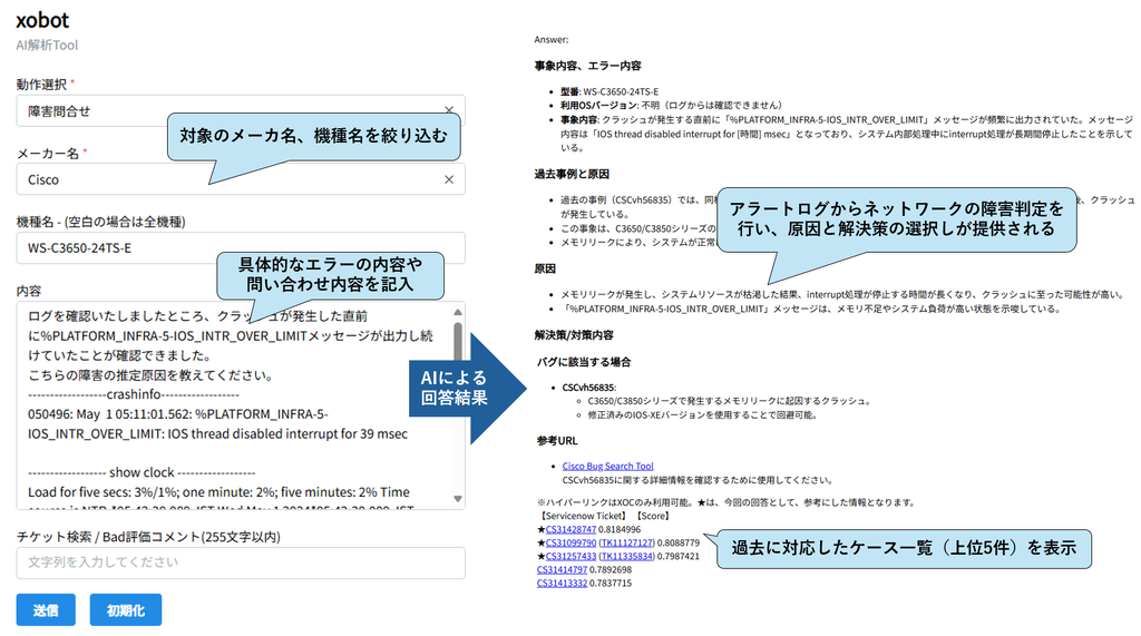XOC過去18年分のナレッジから正確に範囲を絞り込み、ログやConfigから障害判定を行い、解決策の選択肢を提供します。