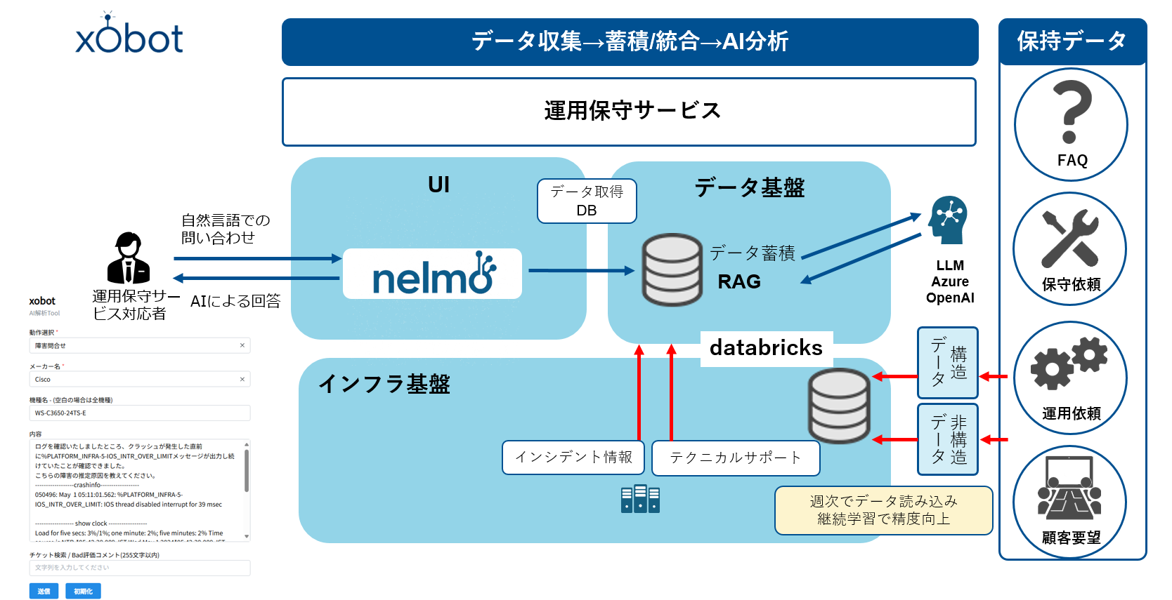 運用保守の現場で取得した構造化データ(Excel等の表やリスト)・非構造化データ(メールやテキスト等の自由な形式のデータ)を収集・蓄積・統合し、AIが分析できるインフラ基盤およびデータ基盤モデルを構築します。これにより、繰り返し発生するインシデントや対応パターンを生成AIで学習し、回答することができるようになります。 - データ学習