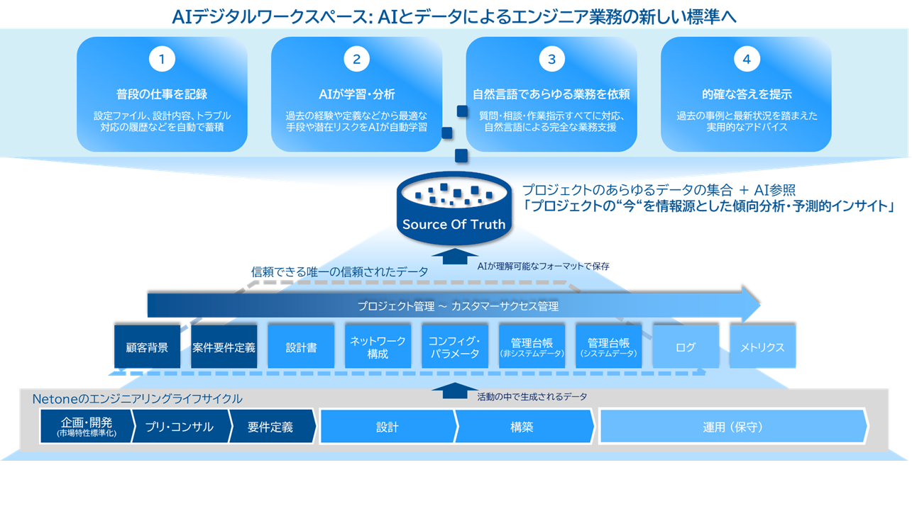 例えば、営業担当者が提案書を作成しようとすれば、AIが過去の類似案件や関連資料を瞬時に提示する。エンジニアがネットワークを設計すれば、AIが構成のレビューや潜在的なリスクを指摘してくれる。障害が発生すれば、AIがログを解析し、一次切り分けを自動で行う。