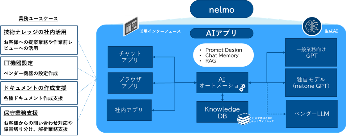 ネットワンシステムズでは2023年度から社内で生成AI活用を推し進めてきました。本格的に生成AIを活用するための基盤「nelmo」の開発をしました。本記事ではnelmoの機能概要について説明、社内での利用状況に関するデータ、考察をご紹介します。