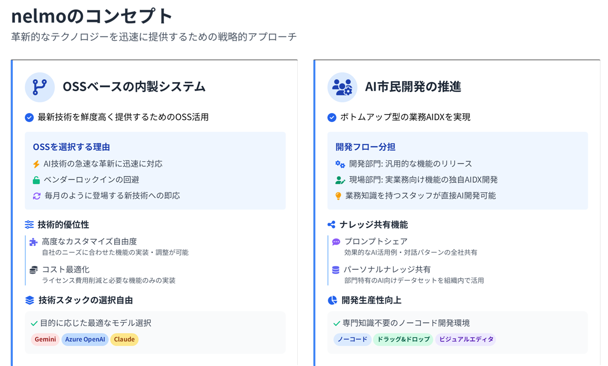 nelmoの進化を支えるもう一つの柱が、開発当初から貫いてきた「OSSベースの内製システム」というコンセプトです。このこだわりが、なぜ重要だったのか。それは、単なるコスト削減のためだけではありません。