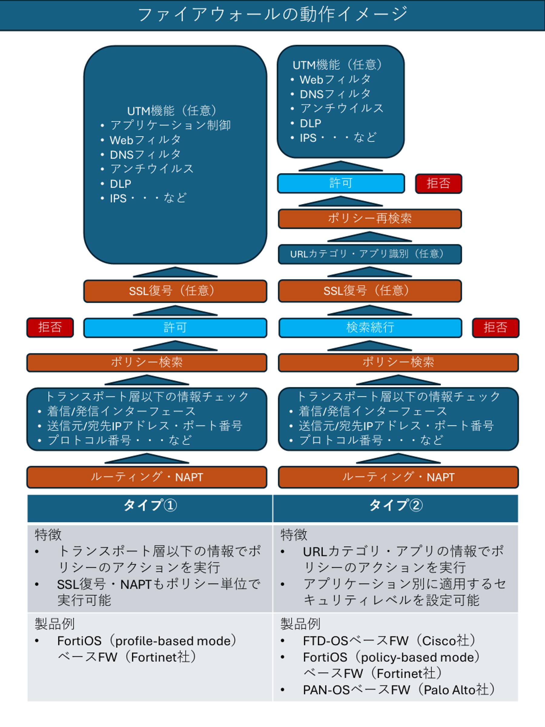 2つのタイプに本質的な違いはありませんが、仕組みを理解し、設計や運用の目的に応じて適切なファイアウォール製品を選択することが重要です。
