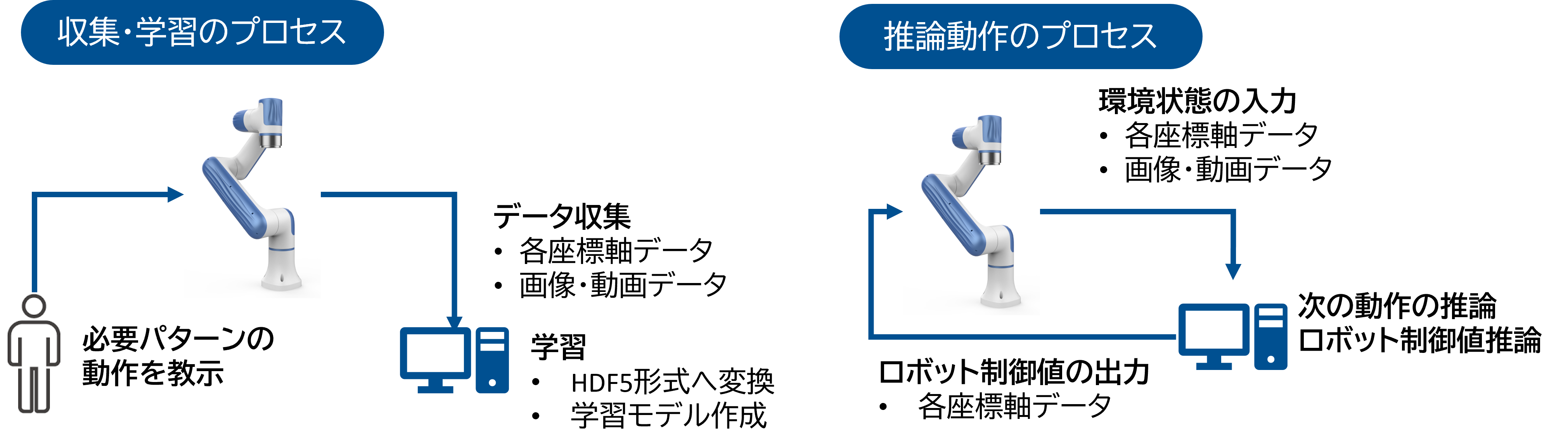 模倣学習はデータ収集・学習のプロセスと推論動作のプロセスに分かれます。