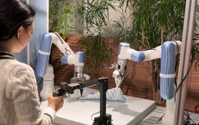 人が2本の教示用コントローラーを動かすと連動してロボットアームも動く仕組みになっています。