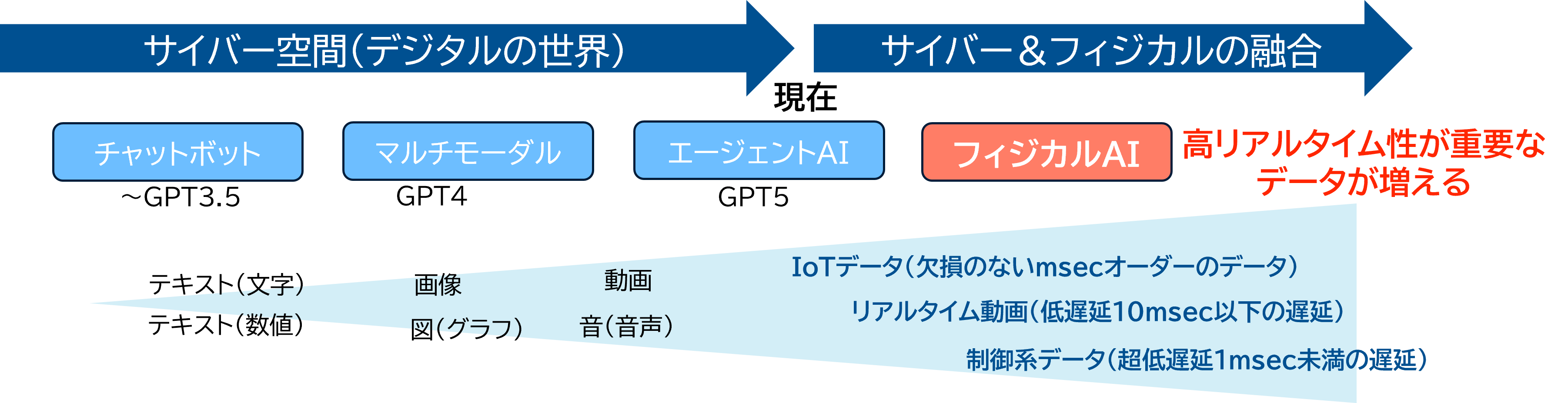 従来の生成AIはサイバー空間のデータを中心に学習・推論してきましたが、フィジカルAIでは物理空間のデータを瞬時に取り込み、サイバー空間からフィジカル空間へ遅延なく制御を返す必要があります。そのため、要求されるインフラ(ネットワーク、エッジコンピューティング、時刻同期、セキュリティ・安全設計など)はこれまでと大きく異なります。