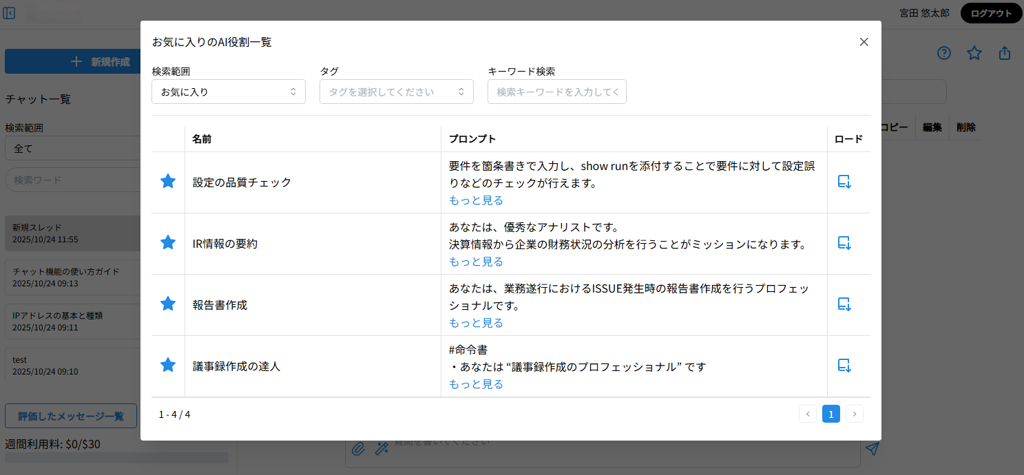 自身で作成したAIへの指示文(プロンプト)を全社に共有できる機能です。効果的なプロンプトを組織全体で活用することで、知見の蓄積・再利用を支援します。 |