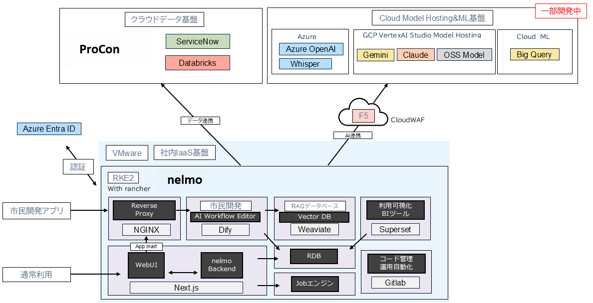 社内向けAIアシスタント「nelmo」は、最新モデルへの追随性とコスト効率、そしてデータセキュリティを両立させるため、アプリ基盤は堅牢な社内オンプレミス環境、LLM推論はセキュアに接続されたパブリッククラウド(Azure/GCP)を利用するハイブリッド構成を採用しています。