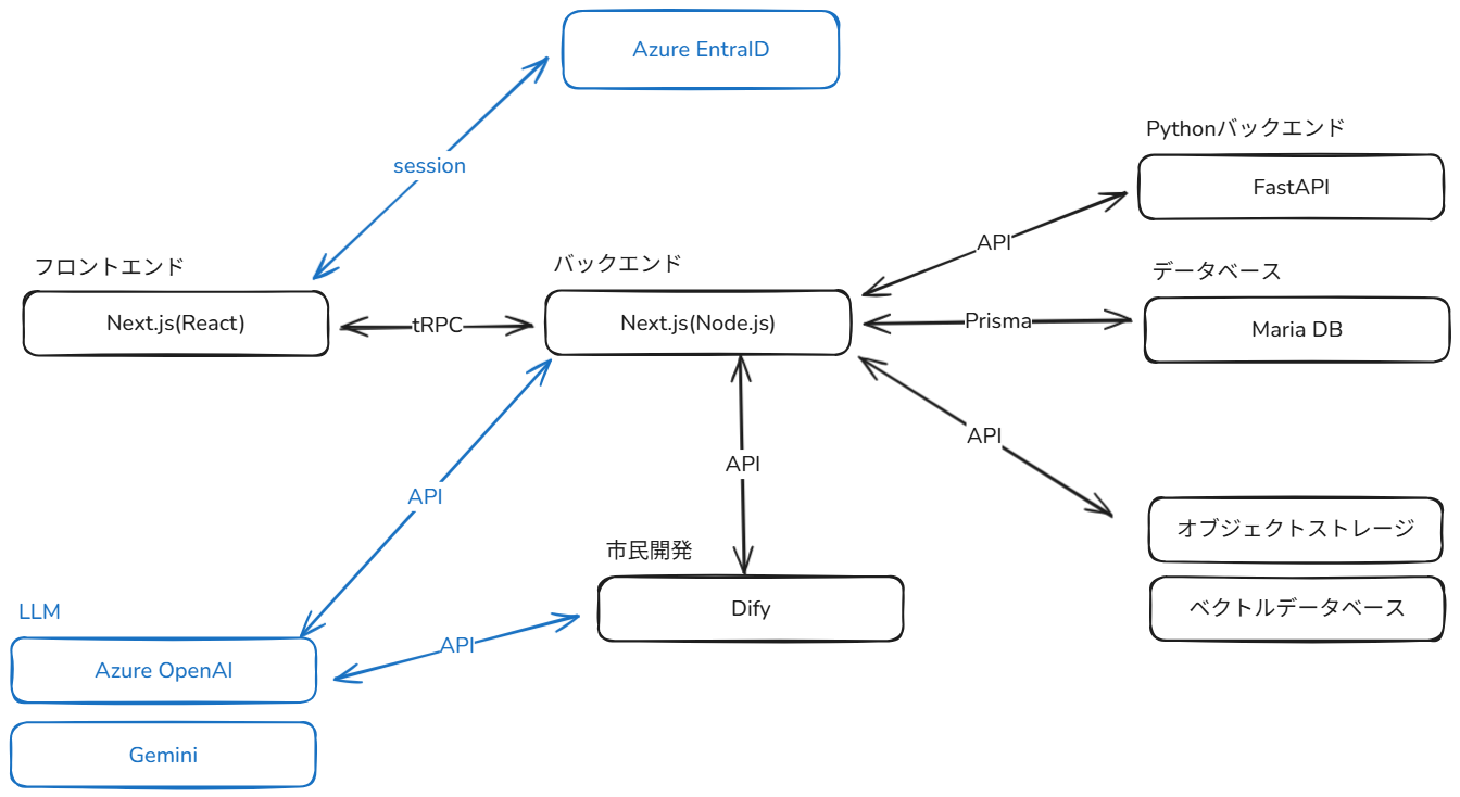 さらに、TypeScript では開発が難しい処理を担うため、FastAPI を用いた専用の Python バックエンド(JOB エンジン)を併設しており、ファイルからの文字抽出や議事録機能における動画から音声への変換などを担当させています。またPythonであれば成熟したライブラリを多く活用できるため、上記のような機能の開発の難易度を下げることができました。