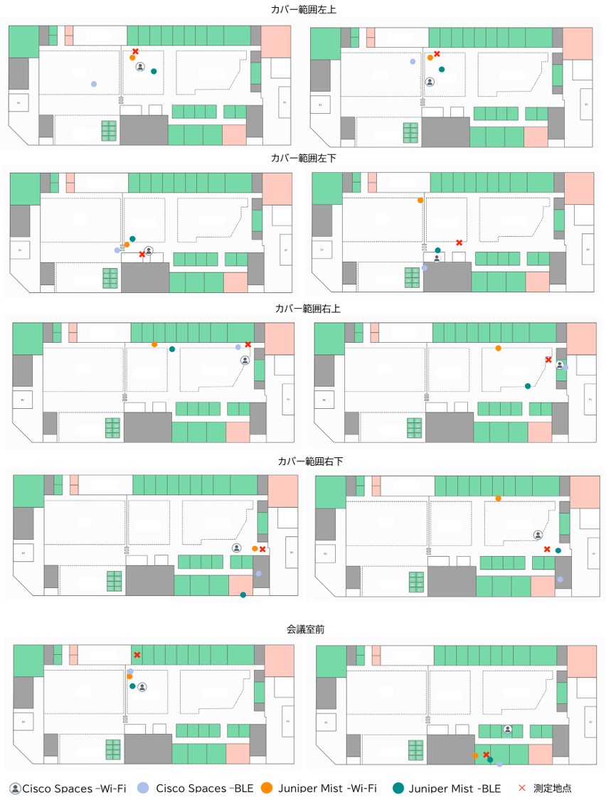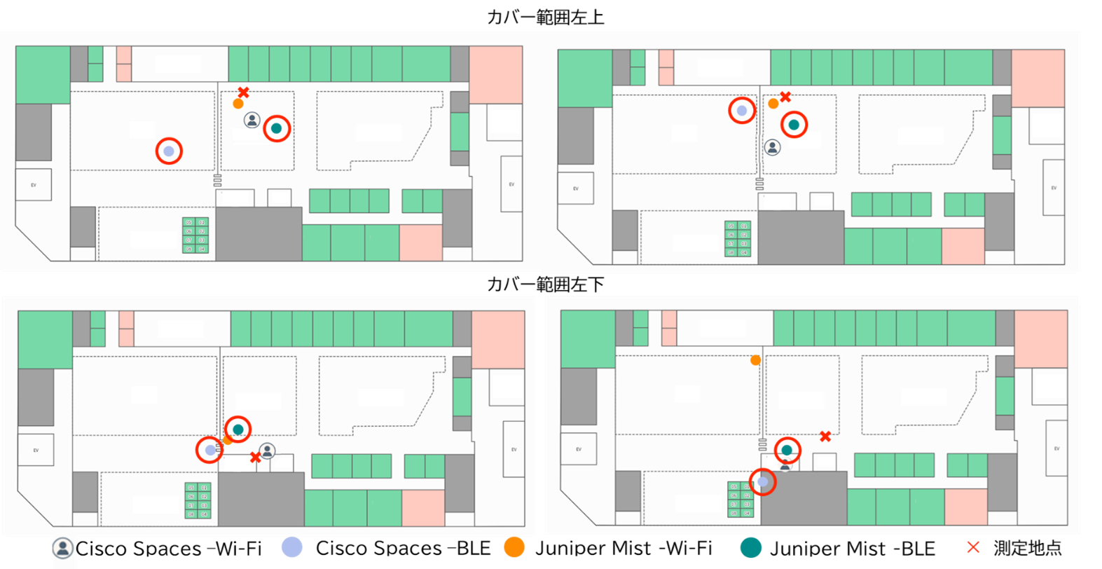 また、CiscoやJuniper双方においてフロア全体で精度にばらつきが生じた点については、業務や検証利用を前提とした AP配置に起因していると考えられます。