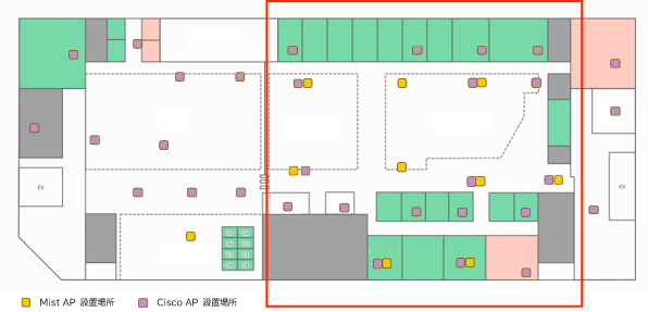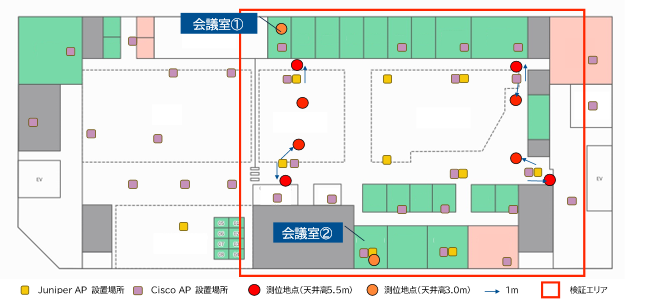 本検証は、Juniper の AP が設置されている右側フロア(画像1赤枠内)を対象として実施しました。