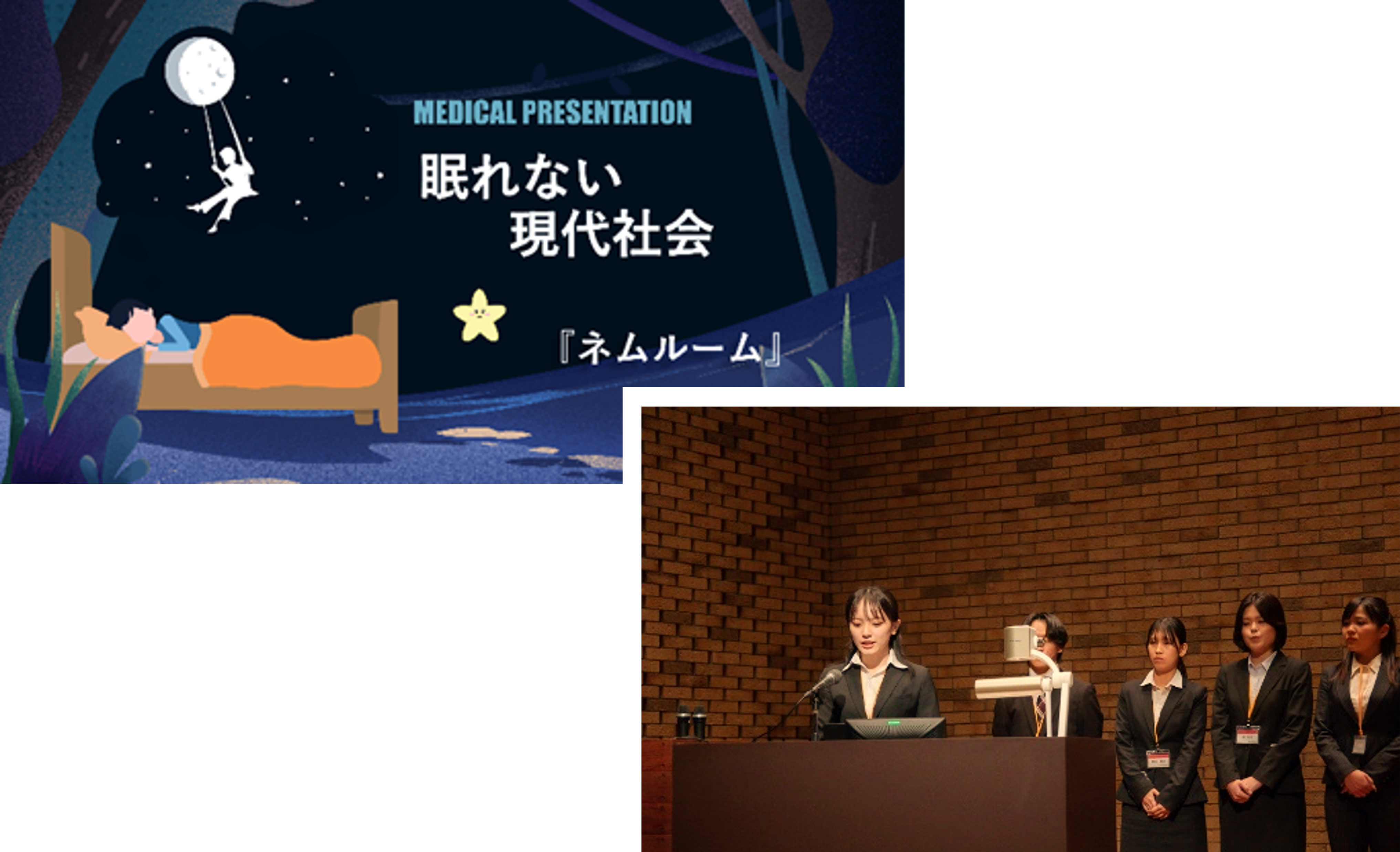世界的に見ても睡眠時間が短いとされる日本人の課題に着目したチームです。「外出先でも質の高い仮眠を取りたい」というニーズに応えるため、IoT技術を搭載した仮眠ボックス「ネムルーム」を発表しました。統計データなどを用いた、説得力あるプレゼンテーションでした。単なる休憩スペースではなく、IoTによる空き状況の管理や、利用者のバイタルデータに応じた環境制御など、テクノロジーで「休息の質」を高めるアイデアは、働き方改革や健康経営の視点からも興味深いものでした。