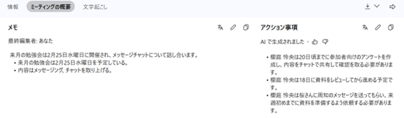 - 「アクション事項」: 会議内で決まった「誰がいつまでに何をするか」というタスクを自動でリストアップしてくれます。