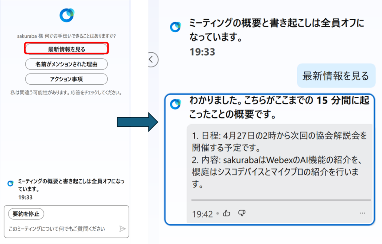 - 「最新情報を見る」: クリックするだけで、直近の会話内容をAIが要約して表示します。途中参加や離席から戻った際も会議内容を把握できます。
