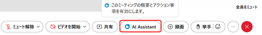 会議中に重要な内容を聞き逃したり、後から会議での決定事項があやふやになったりすることはありませんか?そんな時にAIがサポートしてくれます。会議でAI Assistantを利用するには、主催者がミーティングウィンドウの下部にある「AI Assistant」ボタンをクリックする必要があります。利用開始されると、会議の参加者全員がAI Assistantを利用できます。