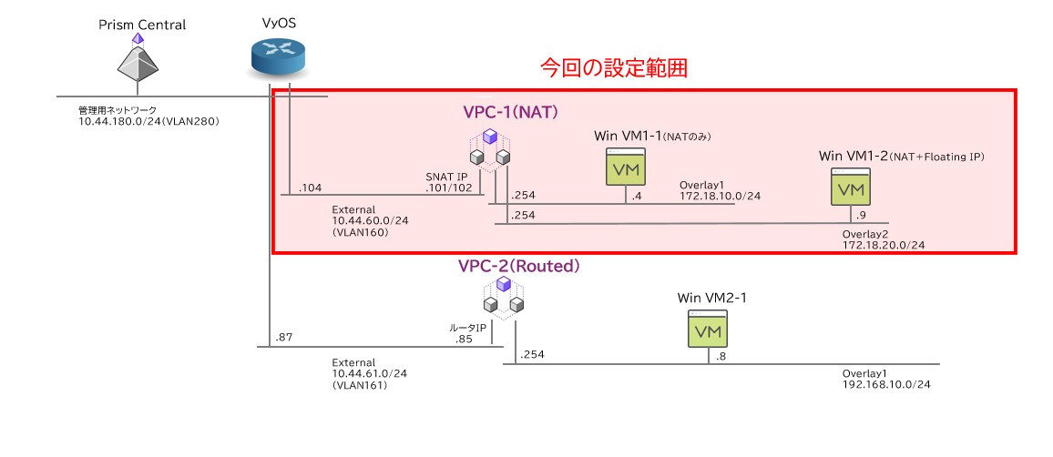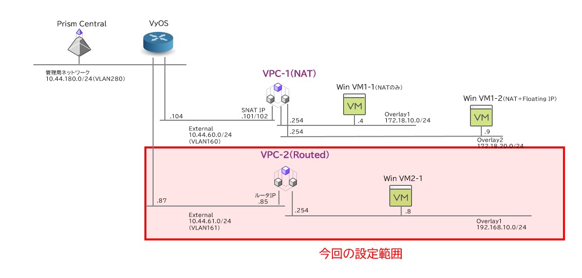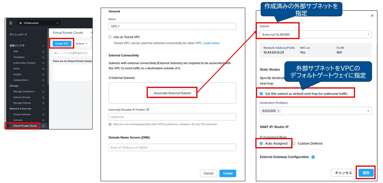 外部サブネットを指定したVPCを作成:Prism Central > Infrastructure > Network & Security > Virtual Private Clouds > 「 Create VPC 」 より下記の様な形で作成する。