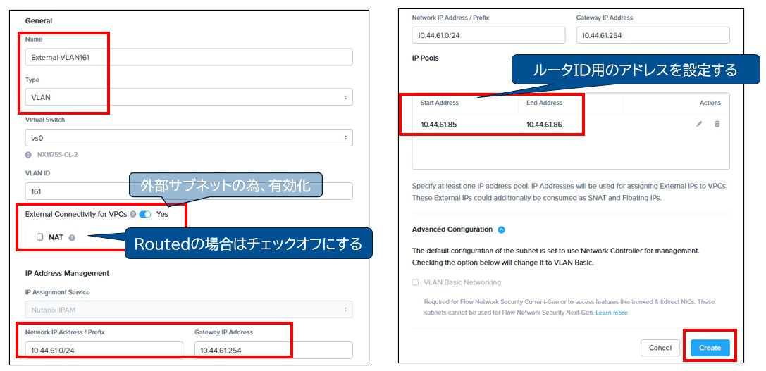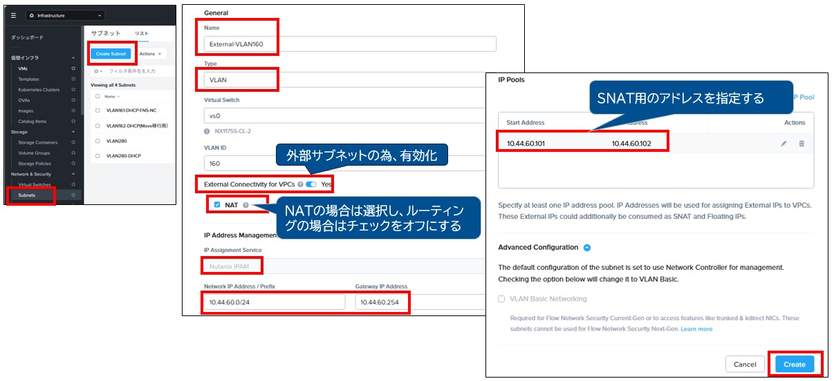External Connectivityを有効にした外部サブネットの作成:Prism Central > Infrastructure > Network & Security > Subnets > 「Create Subnet」 より下記の様な形で作成する。