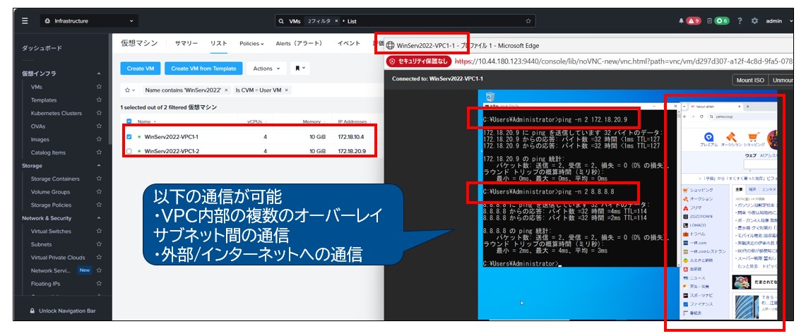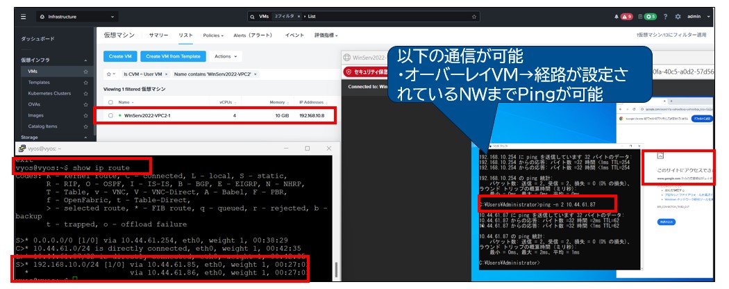 通信確認:VMから、VPC内部のオーバーレイ間の通信と、外部/Internetへの接続性を確認する。