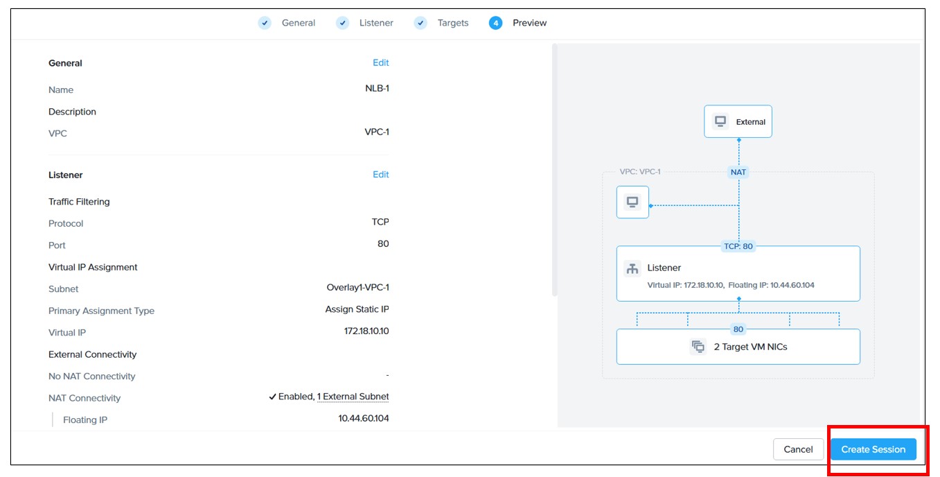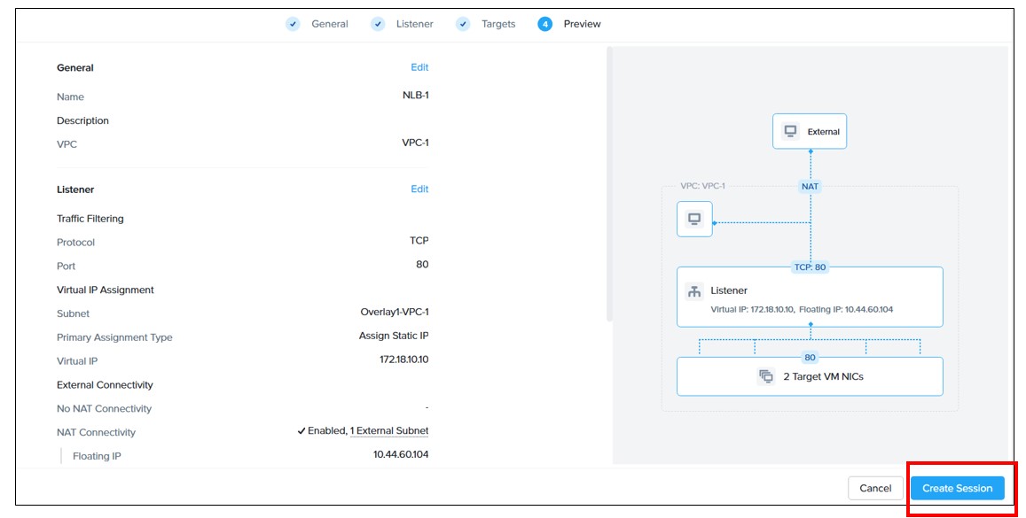 - Prism Central > Infrastructure > Network &Security > Network Services > Network Load Balancer > 「Create Session」より作成