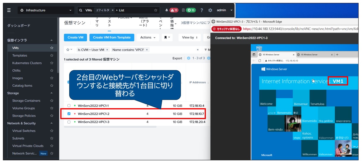 - 2台のWebサーバのうち1台のシャットダウンとともに残りの1台に接続変更される様子が確認出来る。
