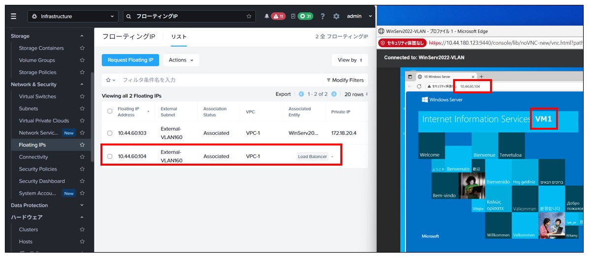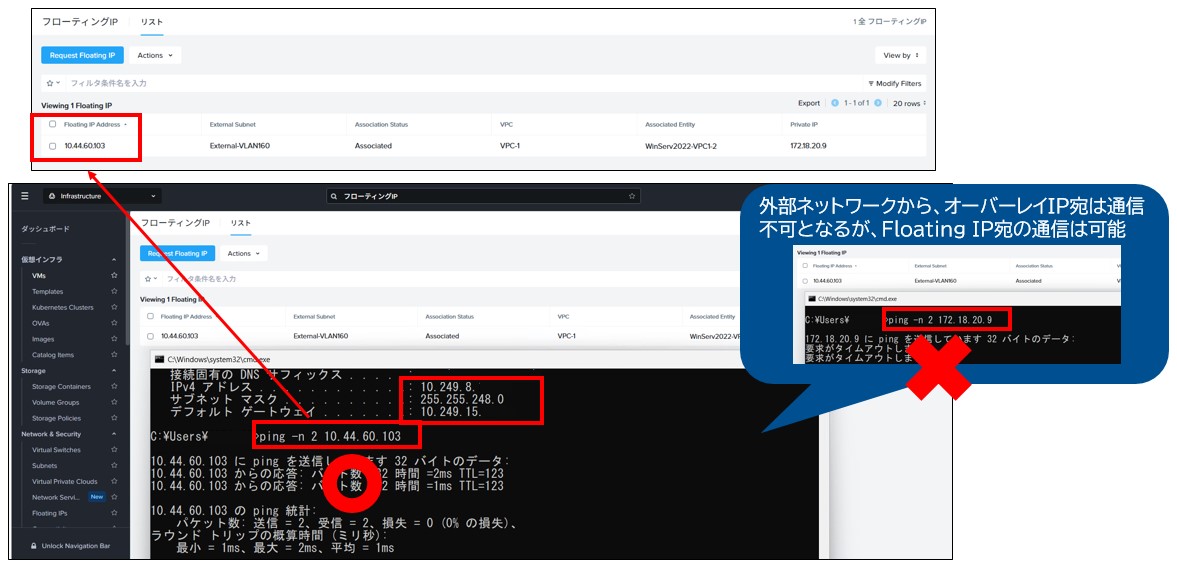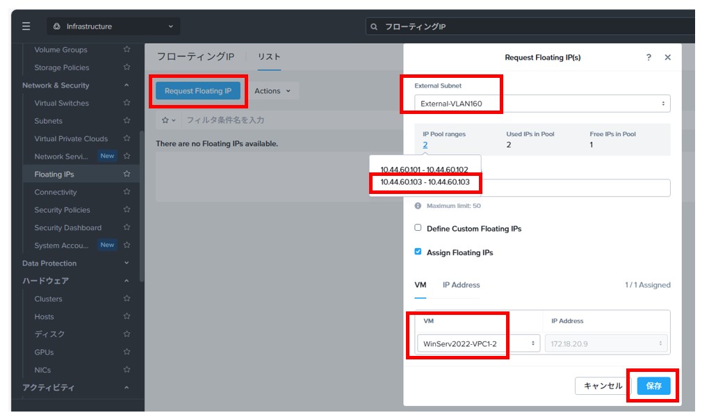 - (オプション)Floating IPの設定と確認:VPC(NAT型)の場合は、各VMにFloating IPを指定する事で、VPCの外部からのアクセスが可能となる。外部サブネットにFloating IP用のアドレスを追加の上(例:10.44.60.103)、「Request Floating IP」より下記の形で設定し、VPC外部からの通信確認を実施する。