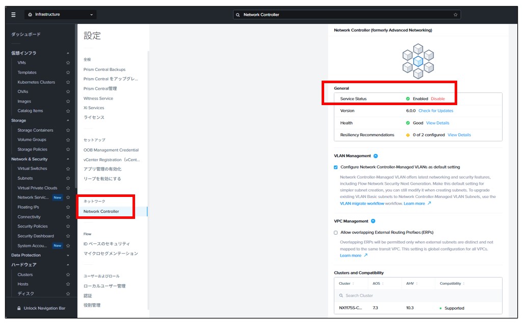 Network Controllerの有効化(Prism Central > Infrastructure > Prism Centralの設定 > 「Network Controller」)