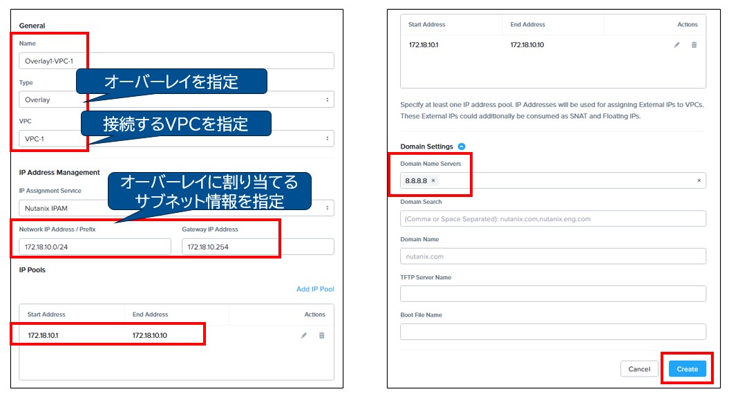 オーバーレイサブネットの作成:外部サブネットと同様に、2つのオーバーレイサブネットを作成する。