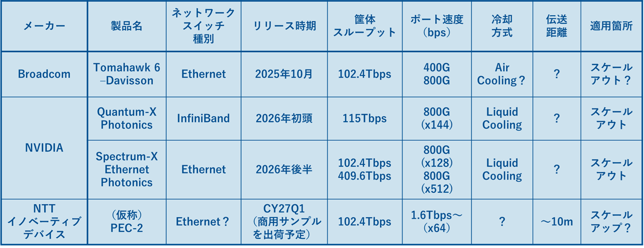 公表情報の解釈に誤りがある可能性もありますが、この3社だけでもその実装に統一感が少なく感じました。また、CPO採用ネットワークスイッチを適用する領域にも違いがありそうです。NVIDIA(恐らくBroadcomも)はスケールアウト(ラック間でのGPUクラスター化)向けのネットワークでの使用を想定しているのに対し、NTTイノベーティブデバイスはスケールアップ(主にラック内でのGPUクラスター化)向けを想定しているようにみえます。