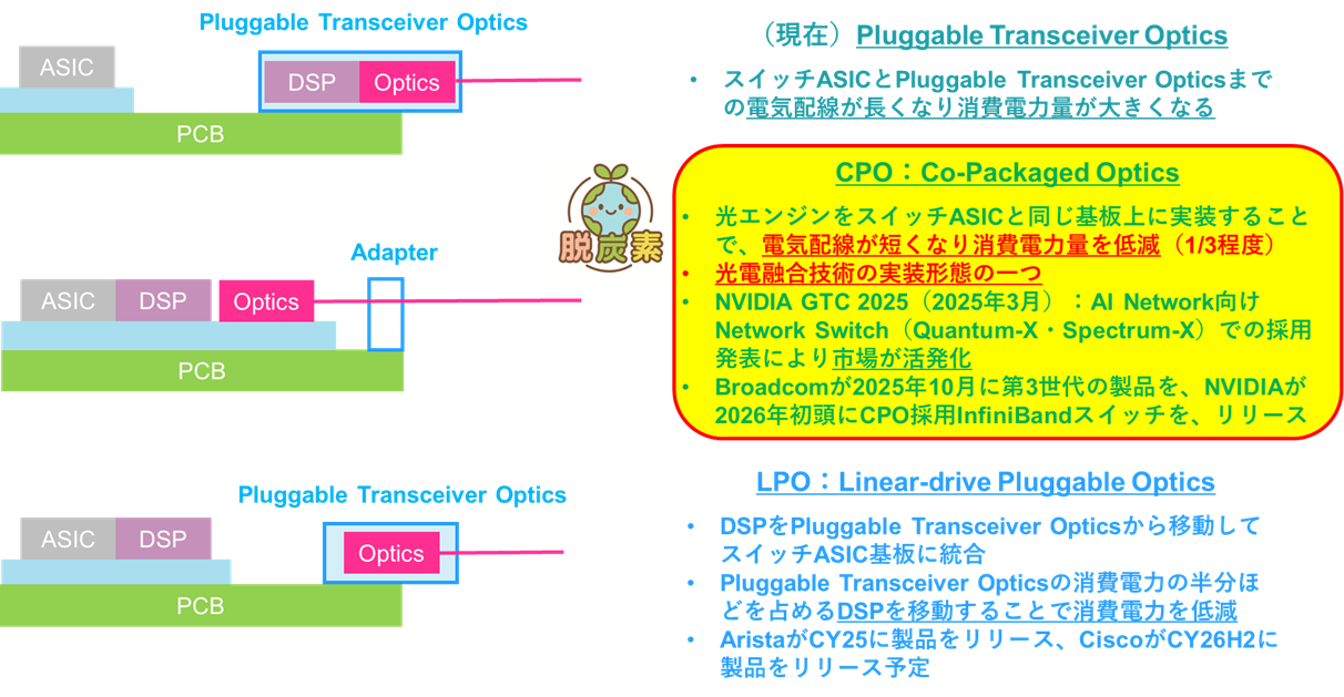なお、CPOと共に、AIデータセンターネットワークスイッチの消費電力を削減する技術として、Linear-drive Pluggable Optics(以下、LPOとする)があります(下図:LPO:Linear-drive Pluggable Optics)。LPOは、DSP(デジタル信号処理)をプラガブル型光トランシーバーからスイッチASIC基板に移動することで、消費電力を低減します。2025年にAristaが対応製品をリリース済で、Ciscoは2026年後半にリリース予定とのことです。