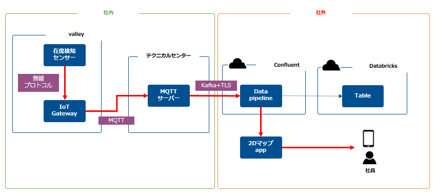 センサーを設置して終わりではありません。収集したデータを既存の2Dマップに追加するため、以下のようなデータアーキテクチャを構築しました。