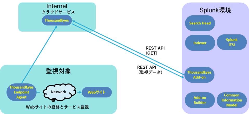 前者がThousandEyes側からSplunk側に対してデータを送る方式に対して、後者はSplunk側からThousandEyes側にデータを取りに行く方式になるため、Splunk ITSIがオンプレミスに存在する場合には後者が容易な実装となります。今回は後者の方式をご紹介します。