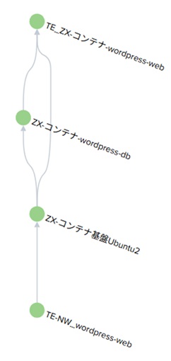 コンテナ上にWordpressサービスを構築し、ユーザがネットワーク経由で利用するような環境で統合ITダッシュボードを活用する例をご紹介します。ZabbixとThousandEyesの2つの監視ツールで監視しており、それらのデータを統合ITダッシュボードで統合して運用高度化を図っています。ツリー形式の統合ITダッシュボードでは監視対象のネットワークが他の全てのサービスに依存されているため最下位層に、そのネットワーク上にコンテナ基盤があり、さらにその上でWordpressサーバのWebサーバとDBサーバがコンテナとして起動している様子が一目で確認できます。なお、このダッシュボードはデフォルトで用意されるものとなり、サービスの定義が終わると自動的に作成されるので管理者が作成する必要はありません。