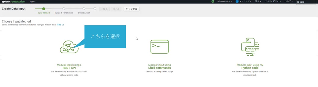 続いてデータの入力を選択すると、「REST API」「Shell Commands」「Python code」のデータ入力方法選択画面に移行します。この画面でShellやPythonを使えば複雑なデータ取り込みに対応できることがわかります。Shellに関してはSplunkをインストールしたホストのOSに依存する点に注意が必要です。今回のThousandEyesとの連携では「REST API」を選択します。