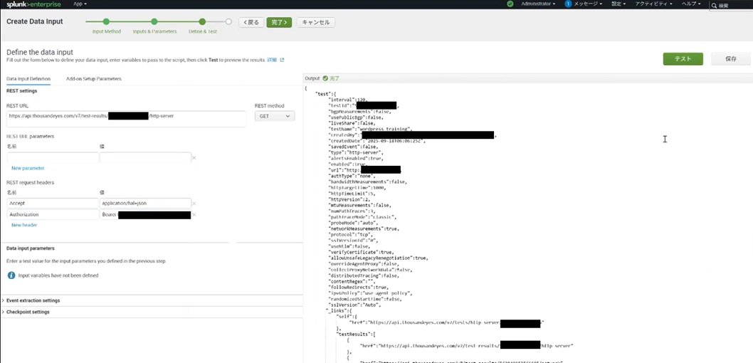 いよいよREST APIの設定画面となります。ThousandEyesのマニュアルに合わせたURL、headerを指定します。認証は、ThousandEyes管理者から得られたトークンを指定します。テストを実行すると、設定が全て正しければ応答が返ってきます。正しい応答があれば、「完了」ボタンを押して保存します。