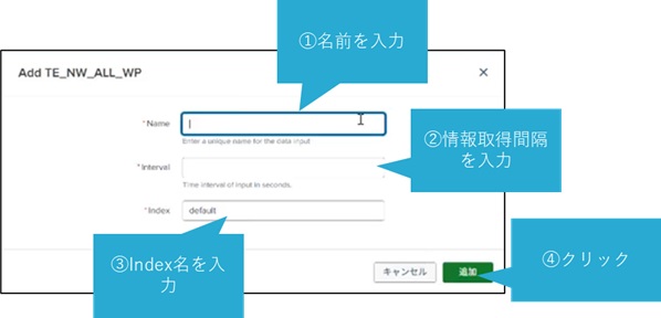 作成したAdd-onは新規Appとして登録されますので、それを指定して新規入力名と情報取得間隔とIndex名を指定すれば、Indexにデータの取り込みが始まります。