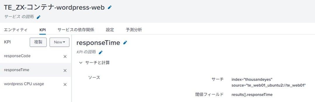 前回ご紹介したZabbixデータ由来のKPI設定と合わせて3つのKPIを持つWebサービスを設定しています。複数の監視ツールから得られたデータを活用して高度な運用を行えることがSplunk ITSIを用いた統合ITダッシュボードの大きな利点となります。これは他の可視化ツールでは実現が難しい内容となります。