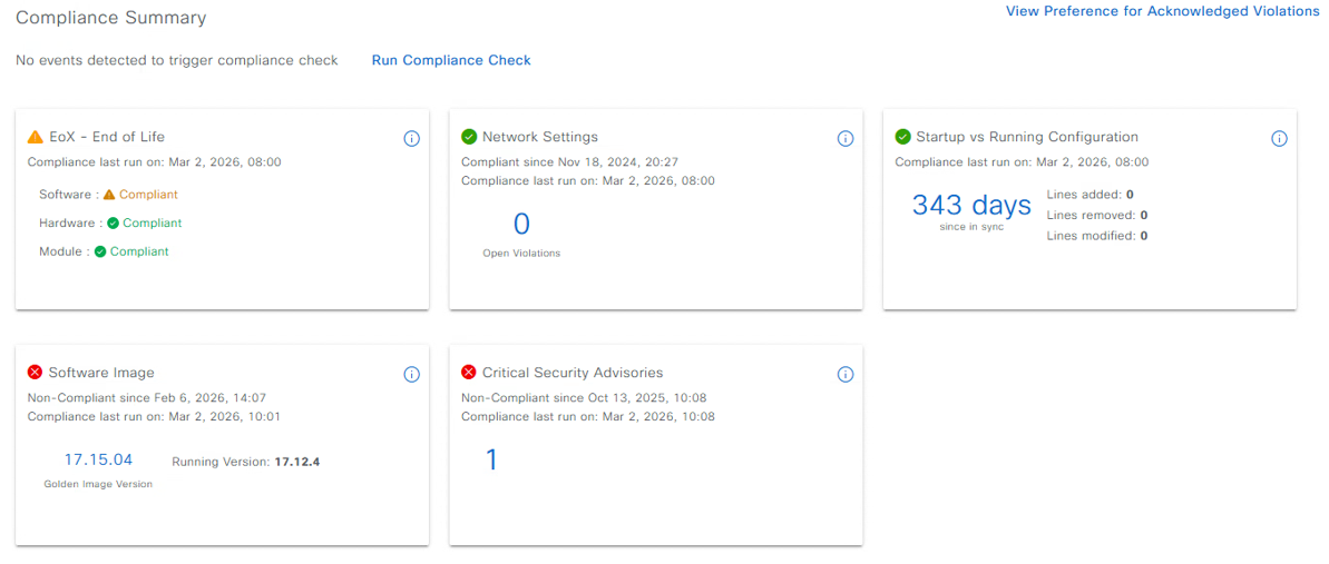 下の画像はあるデバイスのComplianceの確認画面ですがソフトウェアバージョンのEoXが出ていることとサイトで定義したゴールデンイメージが稼働していないこと、CriticalなSAが1件出ていることがすぐにわかるかと思います。