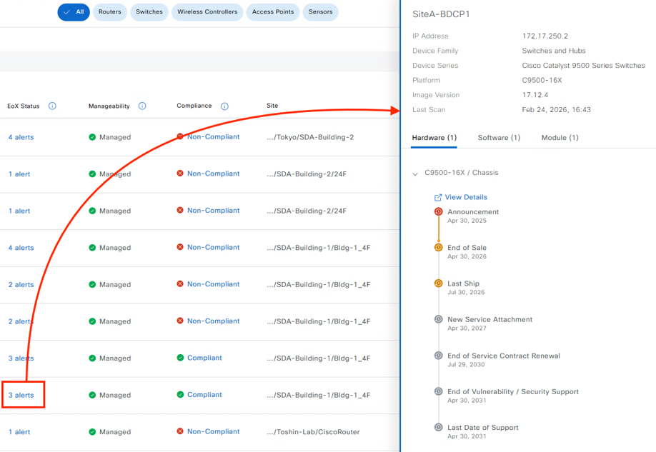 1点目がEoX Statusという項目で各デバイスのハードウェア型番、ソフトウェアバージョン、搭載モジュールといった分類でそれぞれのEnd of SaleやLast Date of Supportの確認ができる機能となっています。