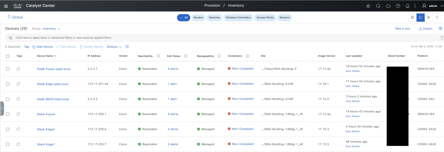 Catalyst CenterのInventory機能では、ネットワーク機器の情報を一元的に収集・管理することが可能です。