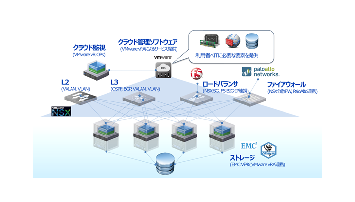 本環境は、複数のシステム連携により実現しており、マルチテナント、サービスポータル、カタログ提供、承認、コスト管理に関しては、利用者のポータルとなるvRealize Automationが役割を担います。システムを自動作成する際に、仮想マシンに必要とされるネットワークはvRAとNSXの連携により、L2/L3、ロードバランサ、ファイアーウォールの設定が自動化され、システムに必要なネットワーク環境を提供します。利用者が、より高いパフォーマンス、より高いネットワーク機能を選択したい場合、NSXはF5 BIG-IP、BIG-IQとの連携やPaloAlto Networks VM-1000-HVとの連携を実現することにより、SSLパフォーマンスの向上やL7ファイアーウォール機能等を提供します。また、ストレージに関しては、EMC ViPRによりストレージを仮想化し、連携を行うことにより、パフォーマンスの選択やより広範囲なインターフェースを利用者に提供可能とします。システム全体の監視・管理、リソース予測、効率測定に関しては、VMware vRealize Operations を使用することで、全体管理を可能にします。