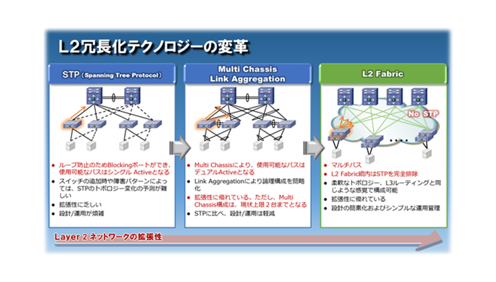 これらMulti Chassis Link Aggregationの制約を解決するテクノロジーとして、 「L2 Fabric」が登場しました。