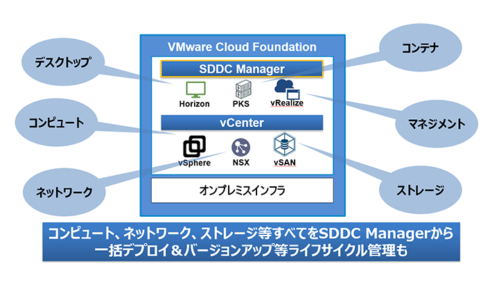 などの基盤も構成することが可能となっており、上記のコンポーネントもVMware SDDC Manageから一括管理します。