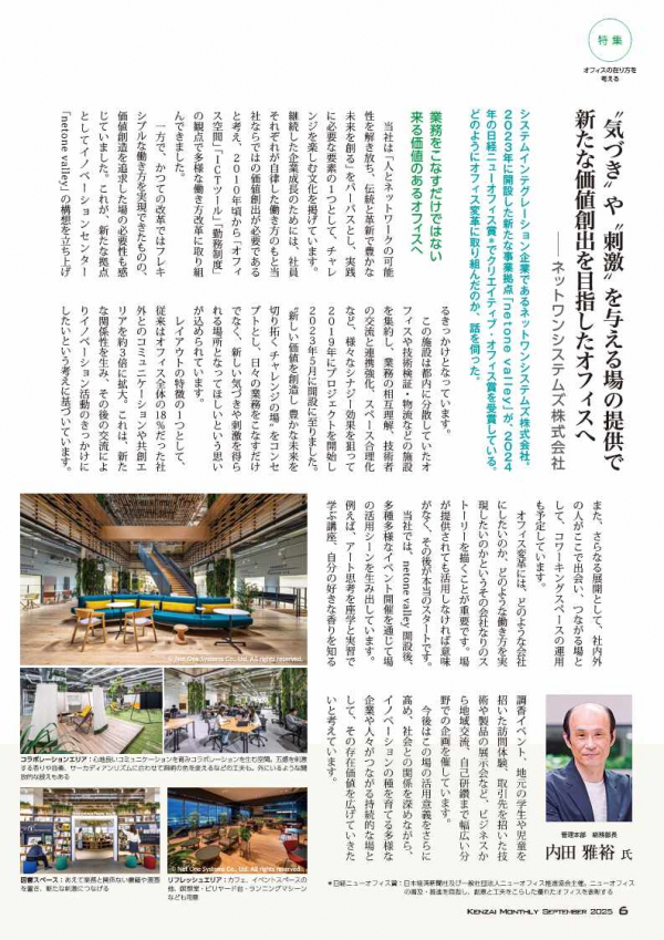 このたび、住友林業株式会社発行の情報誌「建材マンスリー」2025年9月号、特集「オフィスの在り方を考える」にて、弊社netone valleyの取材記事が掲載されました。
