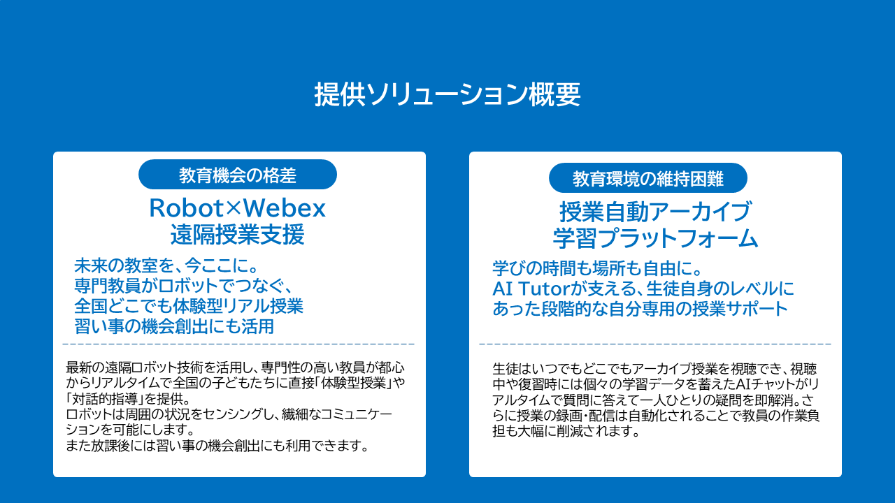 地方・都市間における教育機会の格差に着目し、遠隔授業の開催・受講を支援するソリューションを開発しました。自律走行ロボットのtemiとWebexの連携による遠隔授業支援の機能と、録画データ自動アップロードによる授業アーカイブプラットフォームの提供によって地方における継続的な学びの機会を支援します。